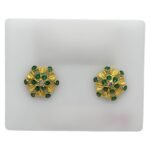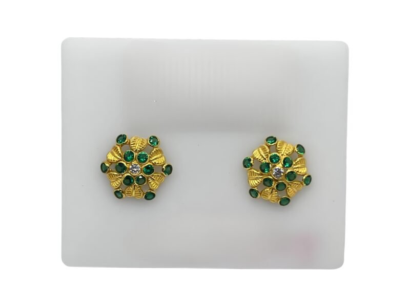 Bring a touch of regal elegance to your ensemble with these exquisite Emerald Blossom Gold Stud Earrings. Crafted in radiant gold, these floral-inspired studs feature a dazzling centerpiece surrounded by leaf-patterned gold details and vibrant green emerald-like stones. Perfect for both traditional and contemporary attire, these earrings are ideal for weddings, festive occasions, or elegant evenings out.